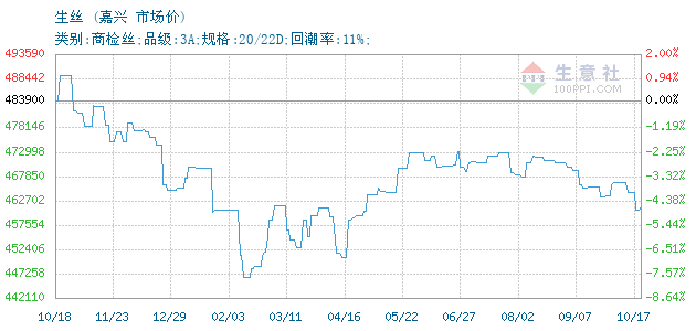 10月17日中國繭絲綢交易市場(嘉興)關(guān)于生絲的報價為461400元/噸。生絲的規(guī)格:類別:商檢絲;品級:3A;規(guī)格:20/22D;回潮率:11%;。該報價有效期為3天。報價提供方:中國繭絲綢交易市場(嘉興)。