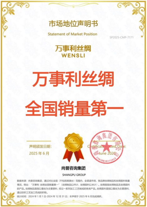 2025年6月,尚普咨詢集團(tuán)對絲綢制品及絲綢面料開展了專項研究,從行業(yè)趨勢、競爭格局、企業(yè)經(jīng)營等方面針對行業(yè)進(jìn)行了全面、系統(tǒng)、廣泛而深入的調(diào)研,以呈現(xiàn)萬事利在行業(yè)中的市場地位。此次萬事利榮獲尚普咨詢【萬事利 絲綢全國銷量第一】聲明,不僅確立了萬事利在行業(yè)內(nèi)的標(biāo)桿地位,彰顯了中國絲綢企業(yè)的品牌影響力與引領(lǐng)作用,也充分印證了傳統(tǒng)絲綢產(chǎn)業(yè)在創(chuàng)新驅(qū)動下煥發(fā)出的蓬勃生機(jī)。